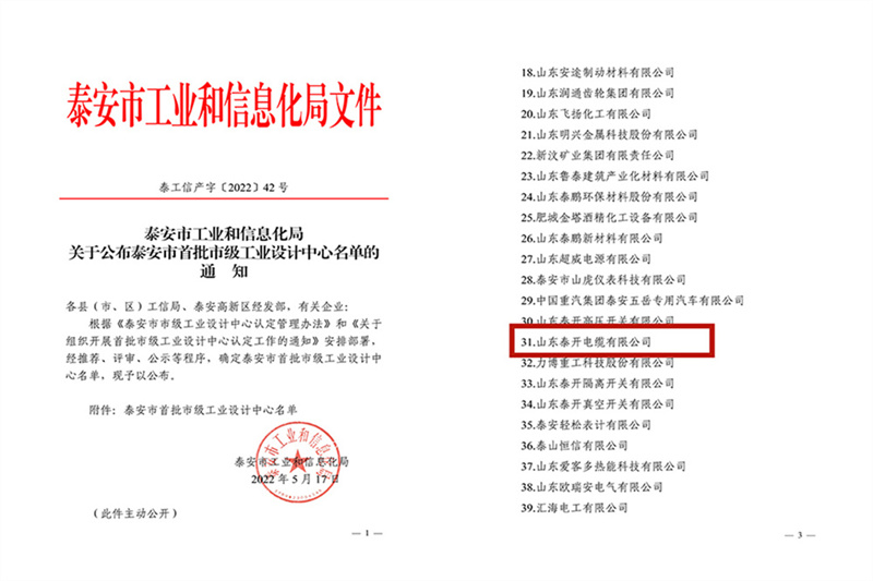 近日,泰安市科技局發布關于公布2023年度泰安市重點實驗室(第一批)建設名單的通知,泰開電纜獲評泰安市電線電纜及附件重點實驗室。